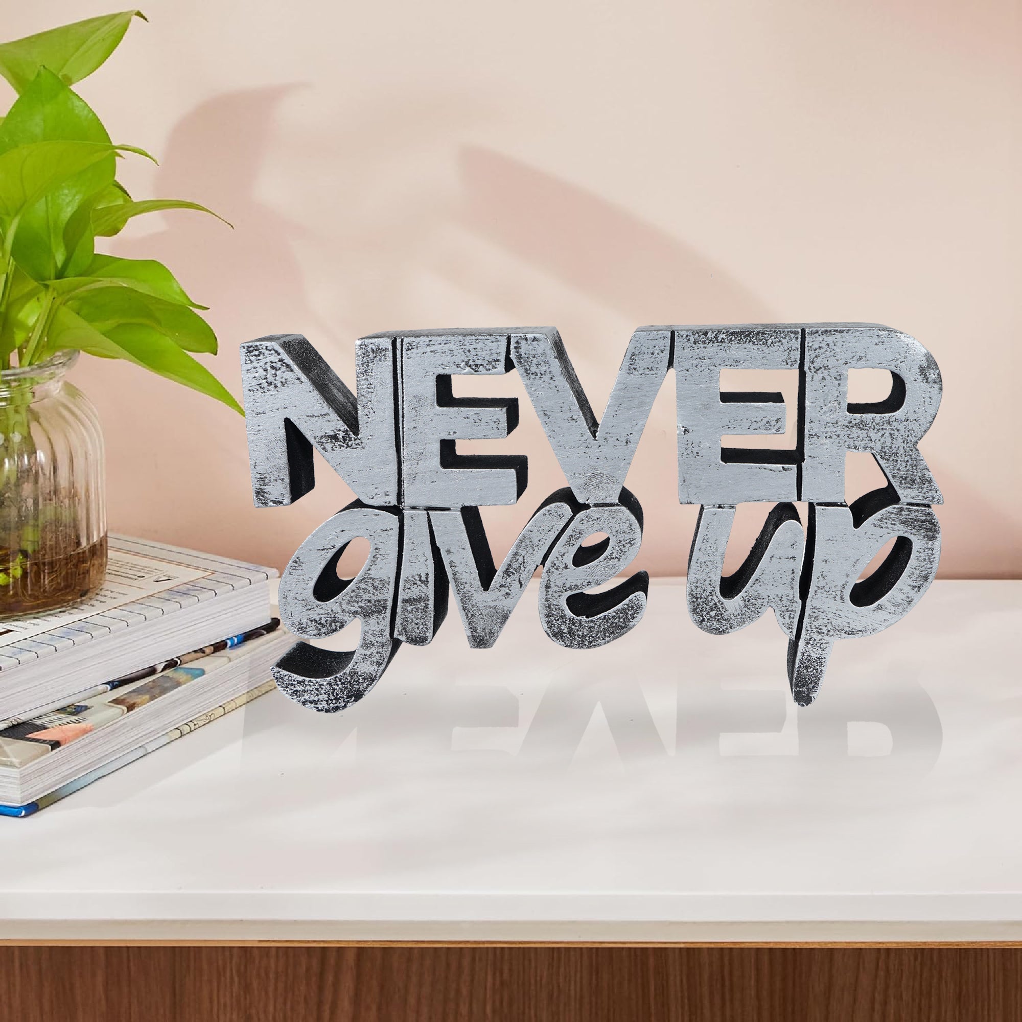 Add daily motivation to your workspace with this beautifully crafted “Never Give Up” Inspirational Desk Showpiece. Designed with bold typography and a rustic silver texture, this décor piece instantly elevates any room with positivity and style.